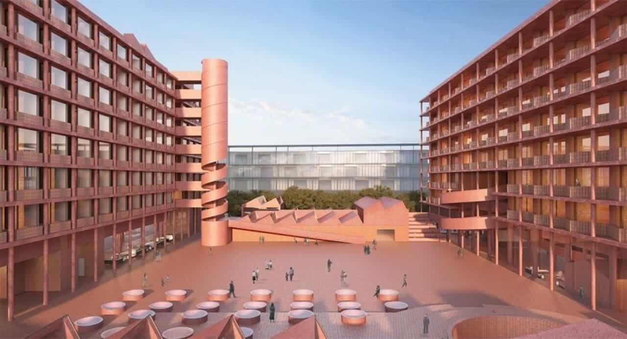 Китайская студия Neri&Hu спроектировала два новых отеля на территории бывшего фарфорового завода в Цзиндэчжэне. Оба восьмиэтажных здания будут расположены на приподнятой площади. Черепичная кровля отсылает к силуэту старого завода, а в отделке комплекса используются красный бетон, красная керамика и красный кирпич.