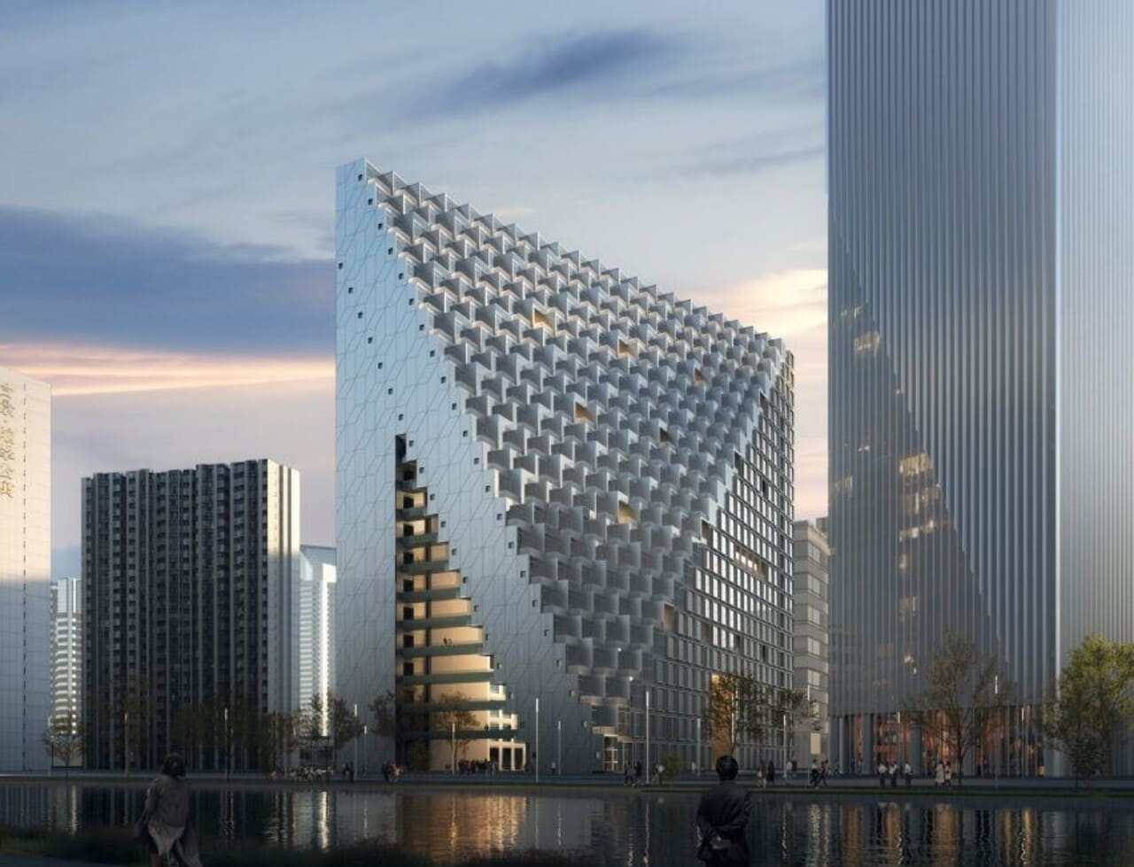 Многофункциональный комплекс на берегу Янцзы спроектирован международной студией Aedas для бренда китайского байцзю Jing. Две башни — офисная высотой 180 метров и гостиничная высотой 100 метров — задуманы как «паруса на реке» и объединены общим стилобатом. Плавные формы стилобата навеяны движением льющегося напитка Jing. Шоурум бренда на углу участка выполнен в форме рюмки и будет служить одновременно выставочным и общественным пространством.