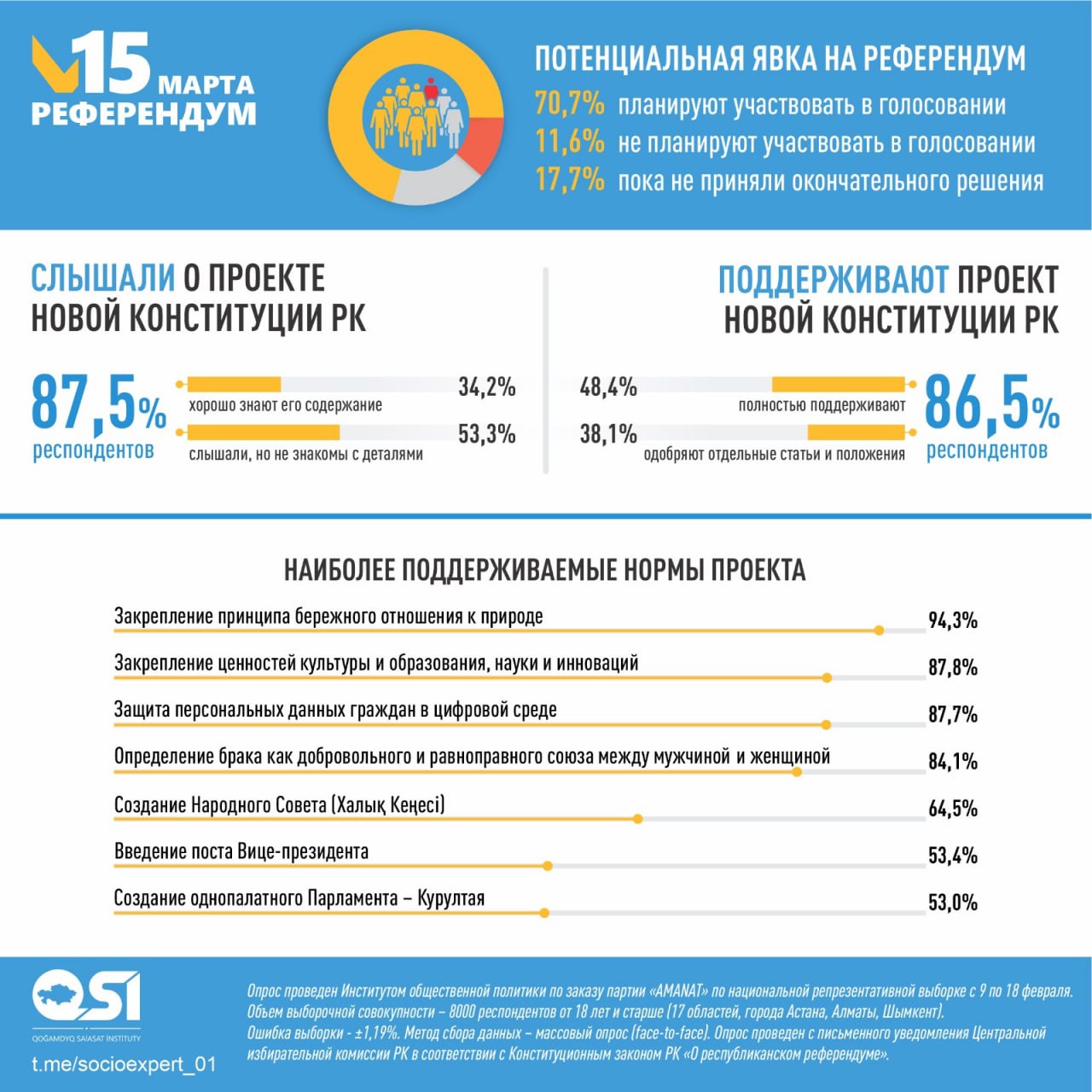 Опрос проведен Институтом общественной политики по заказу партии AMANAT по национальной репрезентативной выборке с 9 по 18 февраля. Объем выборочной совокупности – 8000 респондентов от 18 лет и старше (17 областей, города Астана, Алматы, Шымкент). Ошибка выборки - ±1,19%. Метод сбора данных – массовый опрос (face-to-face). Опрос проведен с письменного уведомления Центральной избирательной комиссии РК в соответствии с Конституционным законом РК «О республиканском референдуме».