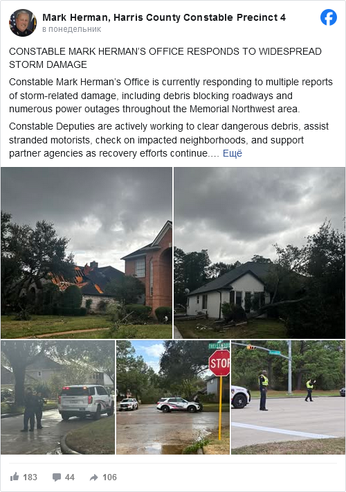 Пожарная служба Хьюстона направила пять специалистов из команды по очистке территорий, чтобы распилить и убрать упавшие деревья, сообщил представитель ведомства Растин Роулингс.