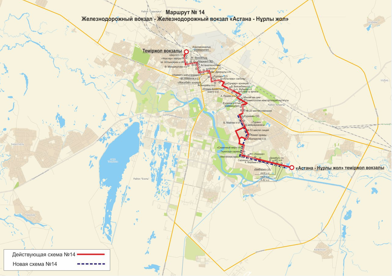 "В целях двухстороннего транспортного обслуживания жителей улицы Обаган поменяется схема движения городского маршрута №14. Также схему движения изменит городской маршрут №64", – сообщила пресс-служба Astana LRT.