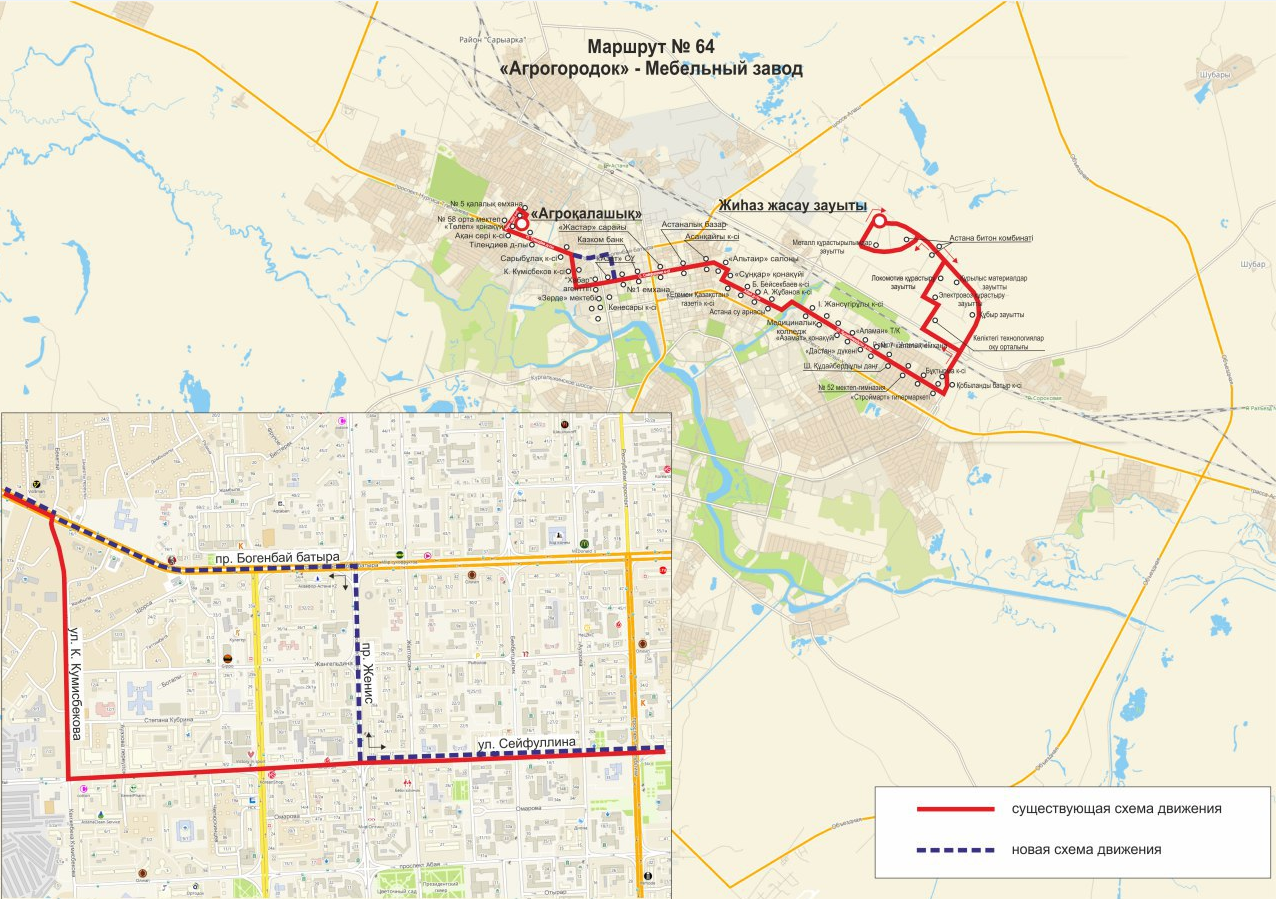От начального остановочного пункта "Агрогородок" до пересечения пр. Н. Тлендиева – ул. К. Кумисбекова без изменения, далее прямо по пр. Богенбай батыра, направо на пр. Женис, налево на ул. Сейфуллина, далее согласно утвержденной схеме движения. В обратном направлении – аналогично.