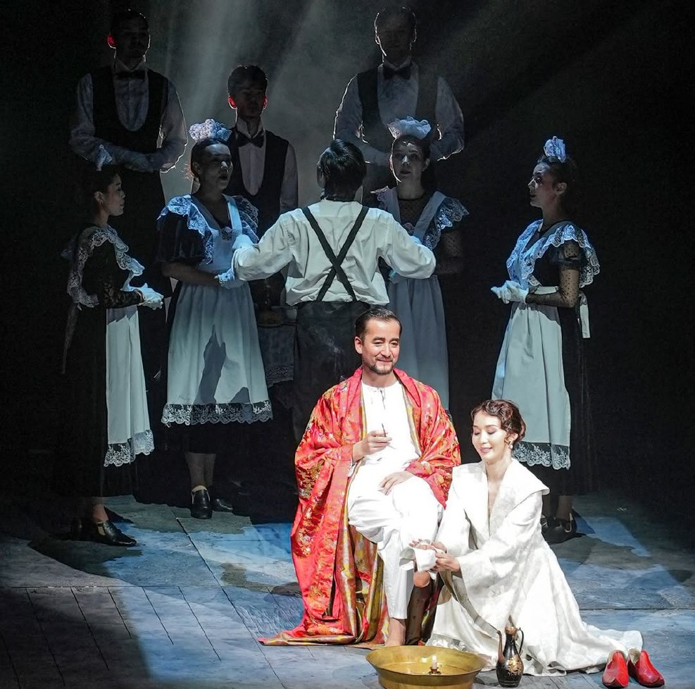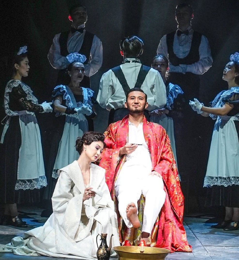 Актер Жанат Оспанов представляет своего персонажа Алексея Каренина не антагонистом, а человеком с «раненым сердцем». А исполнитель роли Алексея Вронского Кайыржан Садыков привносит в спектакль необходимую энергию молодости и страсти.