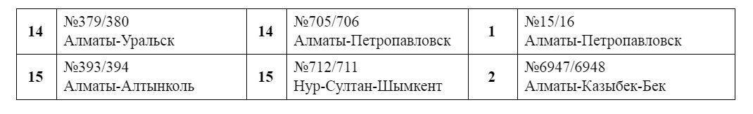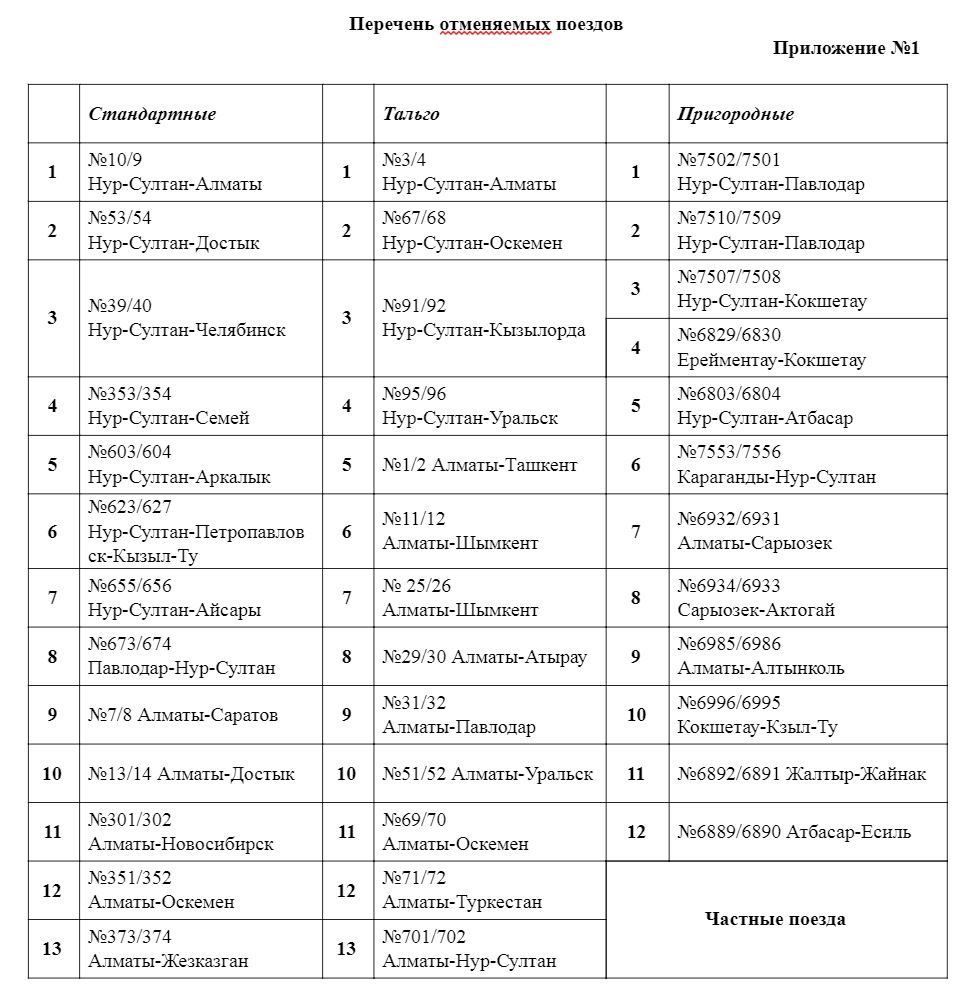 Ввиду объявленного карантина в городах Нур-Султан и Алматы в график движения пассажирских поездов внесены следующие изменения: