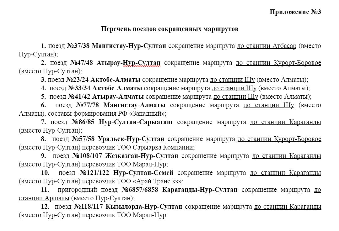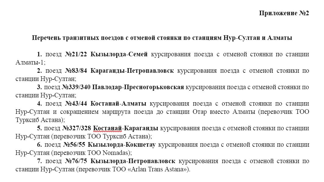 2. Сохраняется курсирование 7 пар транзитных поездов с отменой стоянки по станциям Нур-Султан и Алматы (приложение №2);