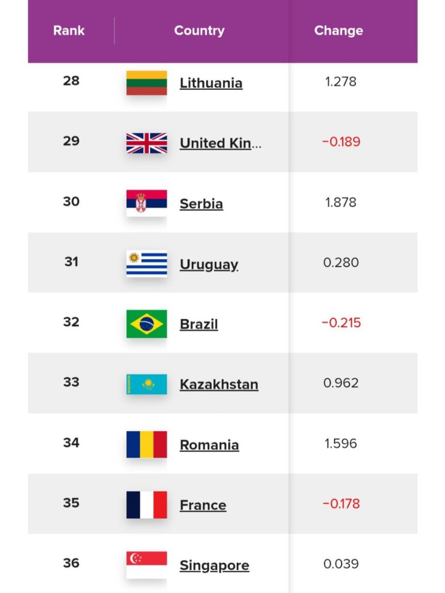 Казахстан занял 33-е место в World Happiness Report 2025, опередив Францию (35-е) и Сингапур (36-е). Среди постсоветских стран республика выглядит уверенно, позиция за год выросла на +0.962, один из лучших скачков в топ-40.