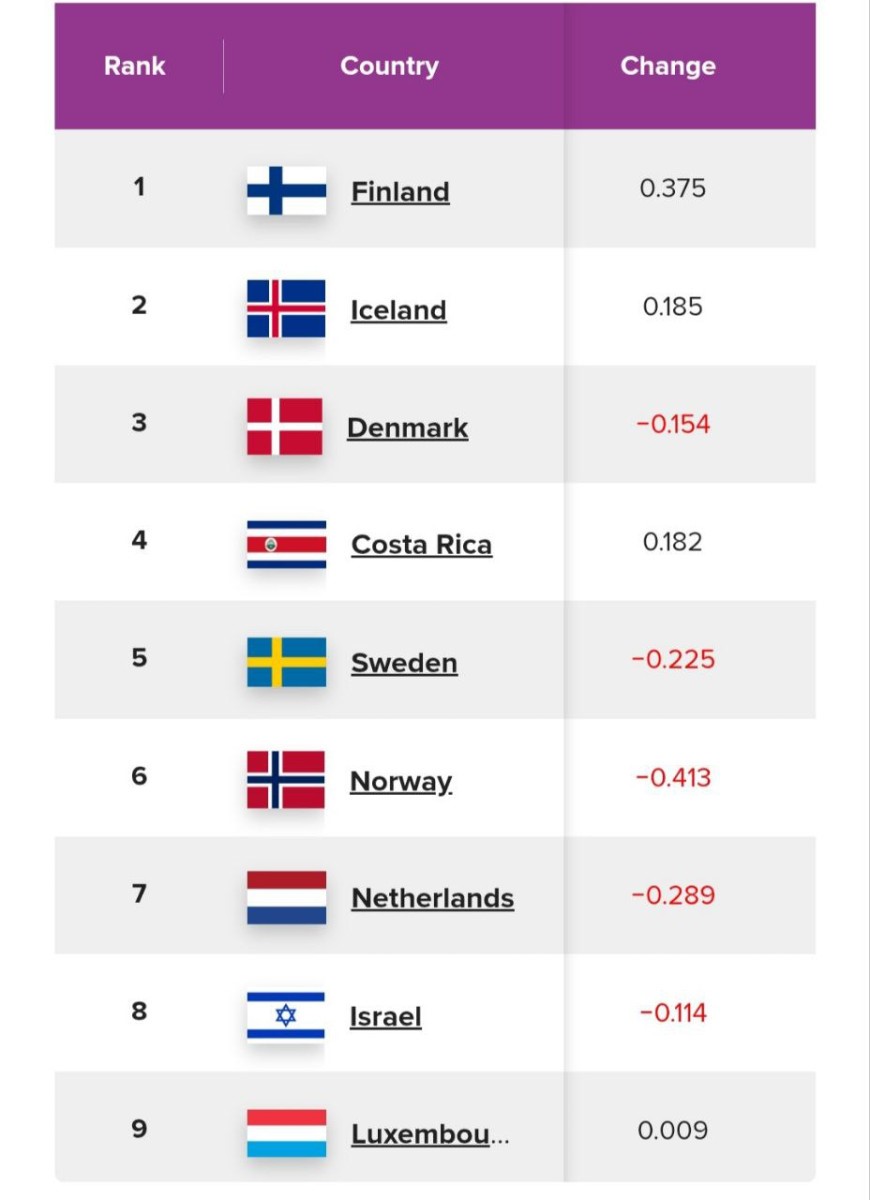 Финляндия - первая восьмой год подряд. Следом - Исландия и Дания. Примечательно, что в топ-5 неожиданно ворвалась Коста-Рика (4-е место) - обогнав Швецию, Норвегию и Нидерланды. Латиноамериканцы традиционно оценивают жизнь выше, чем можно ожидать по экономическим показателям - феномен, который исследователи давно называют «латиноамериканским парадоксом счастья».