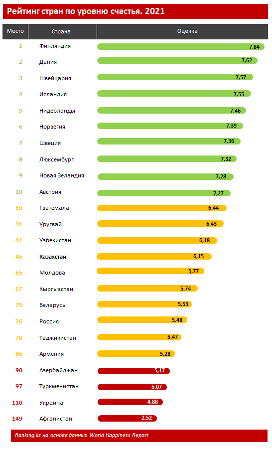 В рейтинге стран мира по уровню счастья Казахстан занял 45-е место из 149. За год страна улучшила позицию на 5 строчек (годом ранее — 50-е место), сообщает