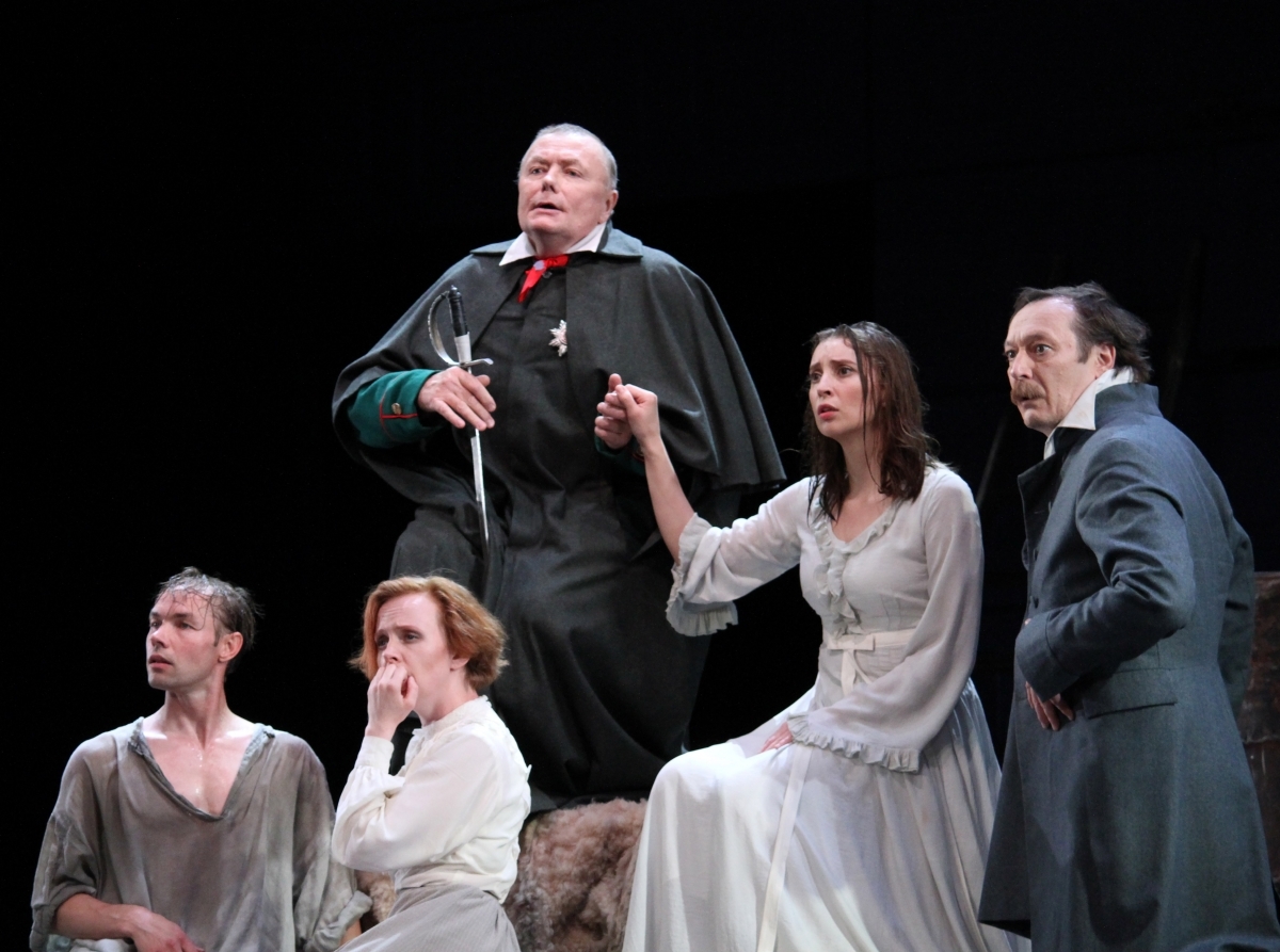 И всех поразил Евгений Павлов – слуга Петрушка, который, не произнося ни слова, стал ключевым персонажем. Спектакль Римаса Туминаса вообще пластичен, герои сверхподвижны, даже ходят колесом по сцене. Сильным (хотя и не бесспорным) оказалось решение сцены бала, где его участники безмолвны и постепенно из смешных и нелепых становятся устрашающими – то ли люди, то ли куклы – просто «прорехи на человечестве».