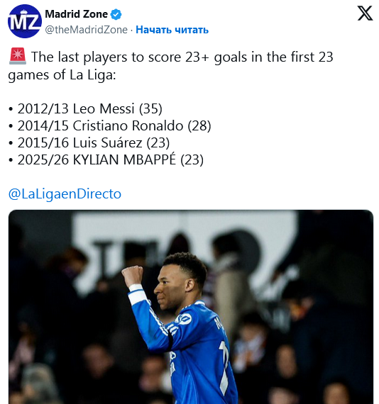 По данным Madrid Zone, Мбаппе стал первым за 10 лет и четвёртым в новейшей истории игроком, достигшим показателя в 23 гола после 23 туров Ла Лиги. Последним это делал Луис Суарес (2015/16), также эту отметку покоряли Лионель Месси (2012/13) и Криштиану Роналду (2014/15).