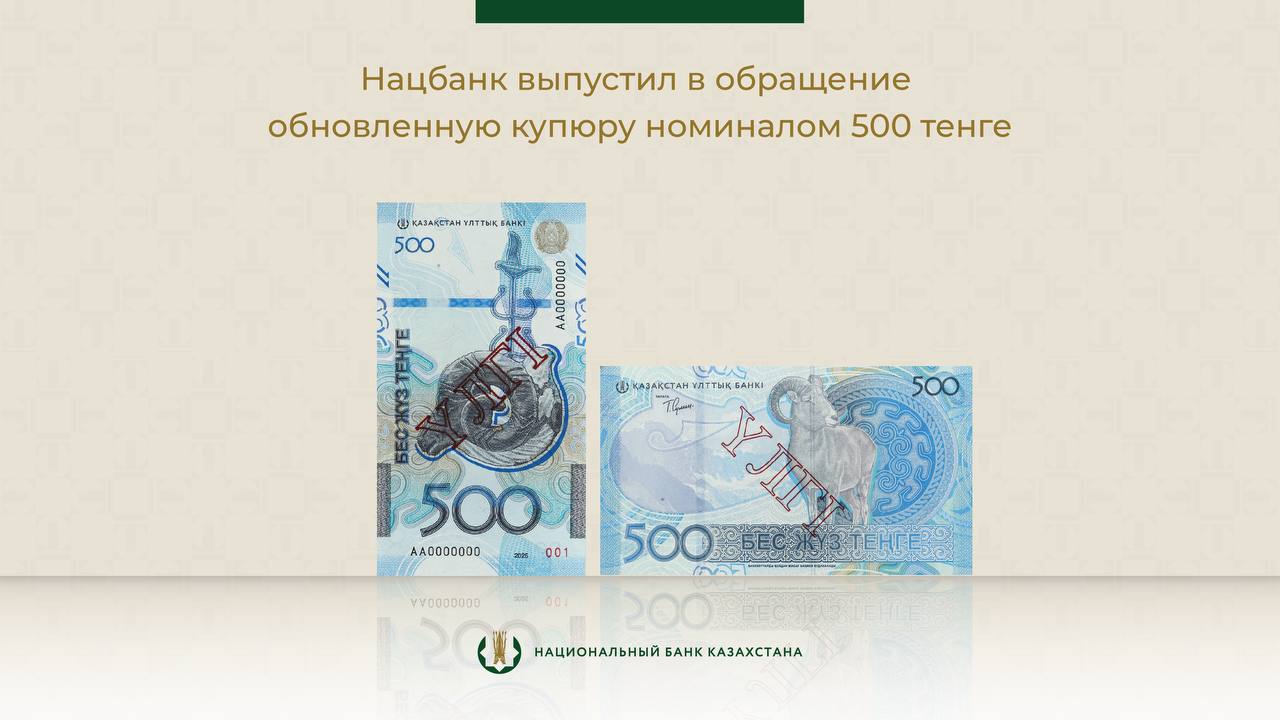 Новые банкноты номиналом 500 тенге поступят в обращение с 25 декабря 2025 года и в течение 24 месяцев будут заменять находящиеся в обращении банкноты национальной валюты номиналом 500 тенге образца 2017 года (далее – банкнота старого образца).