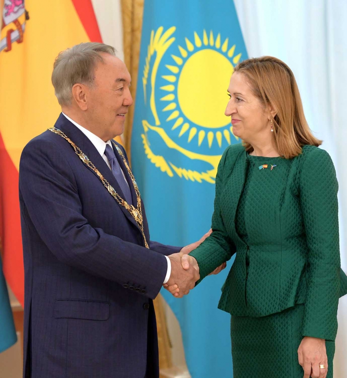 От имени короля Испании Фелипе VI председатель Конгресса депутатов Королевства Испания Ана Пастор наградила Президента Казахстана Нурсултана Назарбаева орденом Изабеллы Католической, сообщает