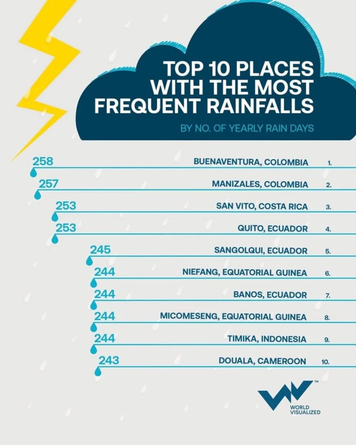 Дождь влияет на жизнь миллионов людей по всему миру, но в некоторых местах он почти никогда не прекращается. Новые климатические данные выделяют десять городов с наибольшей частотой осадков в году, измеряемой количеством дождливых дней