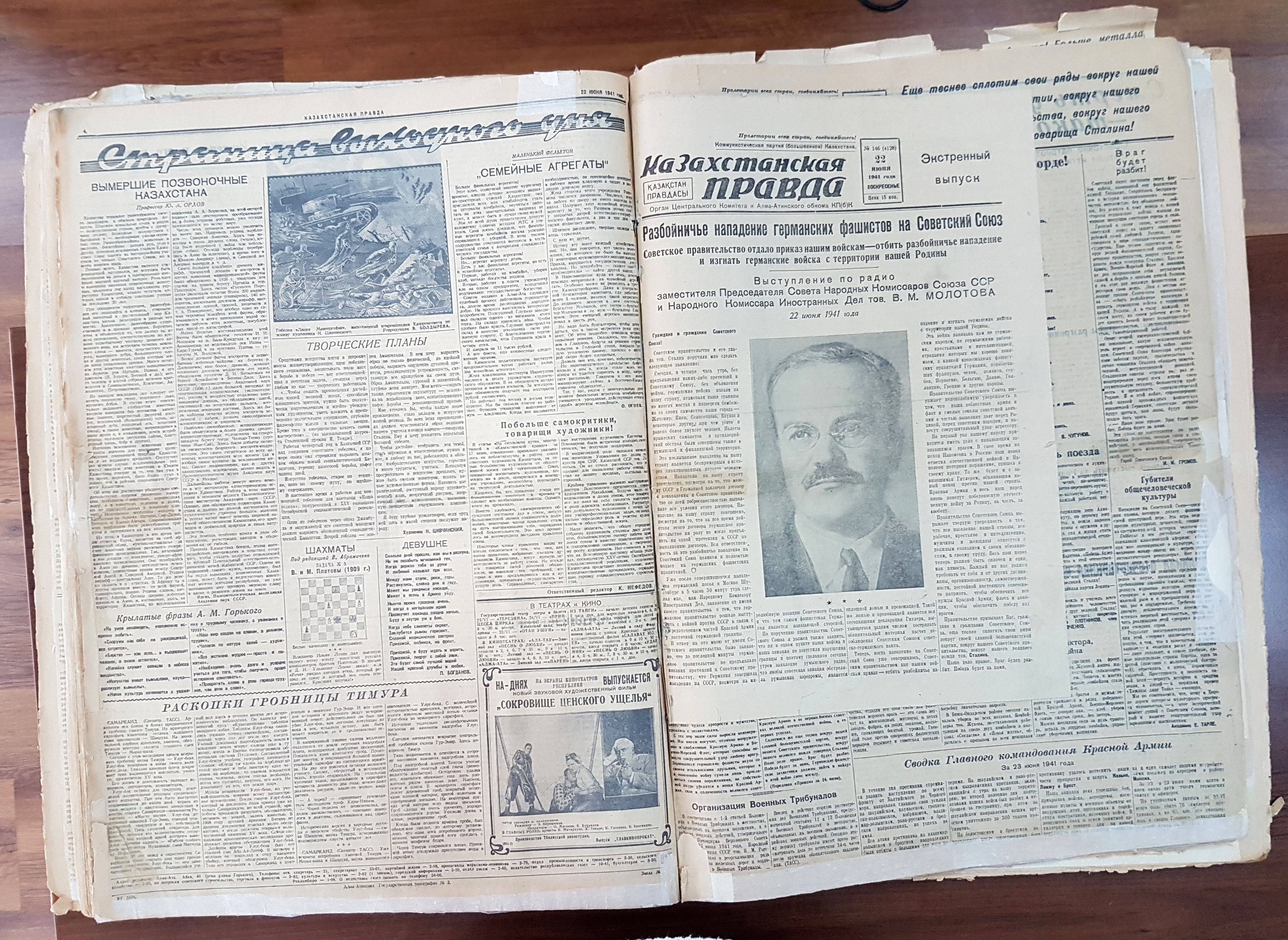 В Национальной библиотеке РК, в отделе редких книг и рукописей, хранится подшивка «Казправды» 1940-х годов. В ней есть и экстренный выпуск, сверстанный непосредственно 22 июня 1941 года в связи с нападением Германии на СССР. Главная тема – радиообращение заместителя председателя Совета народных комиссаров СССР, народного комиссара иностранных дел Вячеслава Молотова об акте агрессии. И тут возникает вопрос: почему о начале войны заявил он, а не первый руководитель страны?