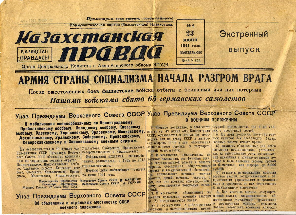 Война давно закончилась. Более семи десятков лет мы празднуем Великую Победу над фашизмом. Все меньше с каждым годом фронтовиков. Но даже спустя десятилетия можно увидеть, как первая полоса «Казахстанской правды», запечатлев эпоху в буквах, рассказывает о тех страшных днях. Ведь не зря газеты называют летописью страны.