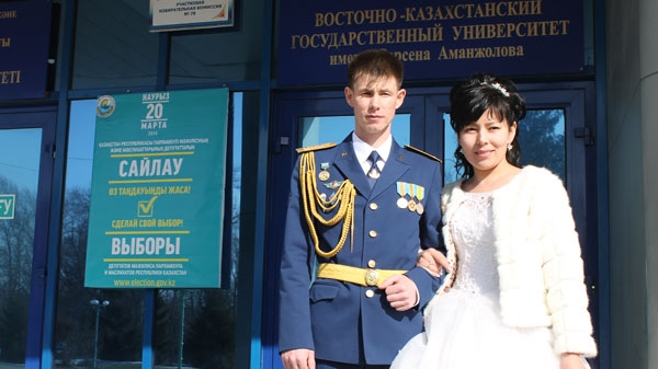 – Мы пришли проголосовать за светлое будущее своей страны, – уверенно говорит глава новой ячейки общества. Молодожены познакомились в Серебрянске, где проходит служба кадрового офицера, гвардии капитана войск противовоздушной обороны РК Тимура Мухамеджанова.