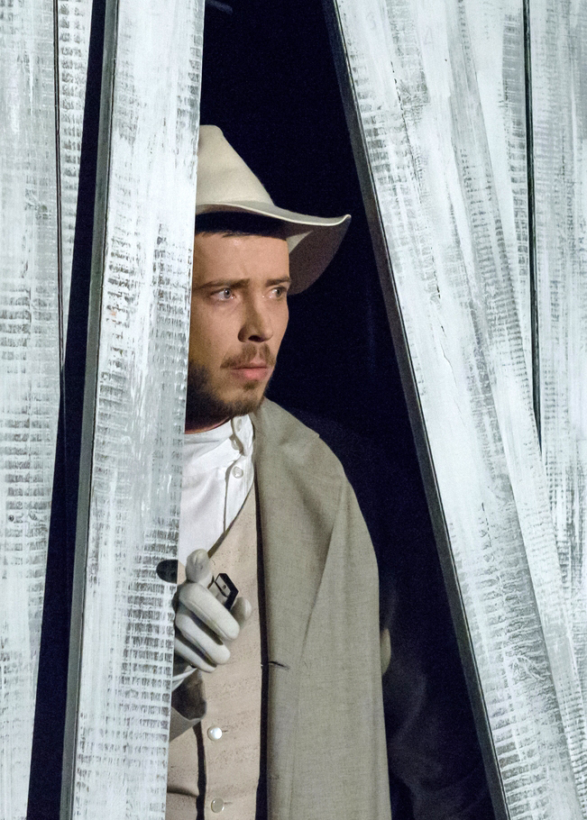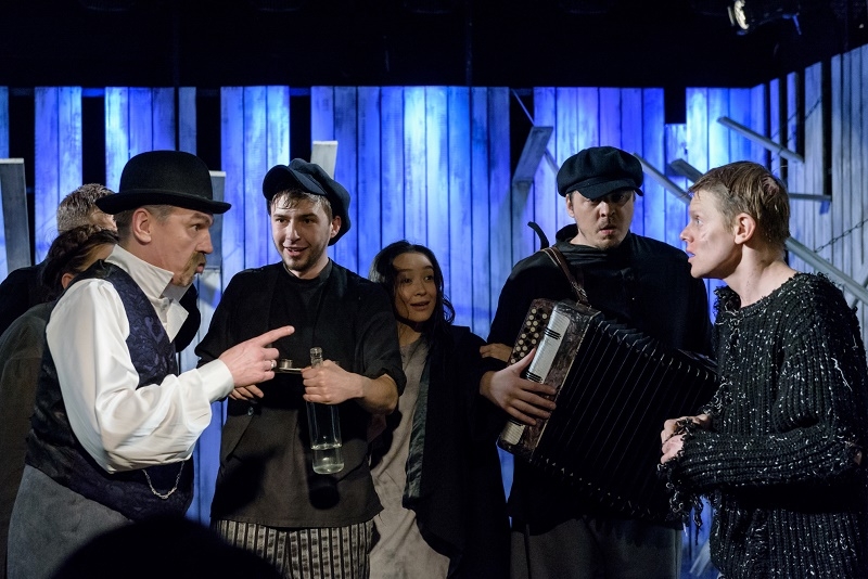 Особую роль в спектакле играет и забор, которым огорожена не только сцена, но все пространство зрительного зала. Он при разных обстоятельствах становится стеной, разделяющей мир видимый и невидимый. За его пределами – просторы города, река, сад с потаенной калиткой, где свиданничает Варвара с Кудряшом, а позже Катерина с Борисом. Здесь по вечерам под музыку, сдобренную чаркой, с шутками да прибаутками предаются веселью Шапкин, Ваня Кудряш и их приятели.