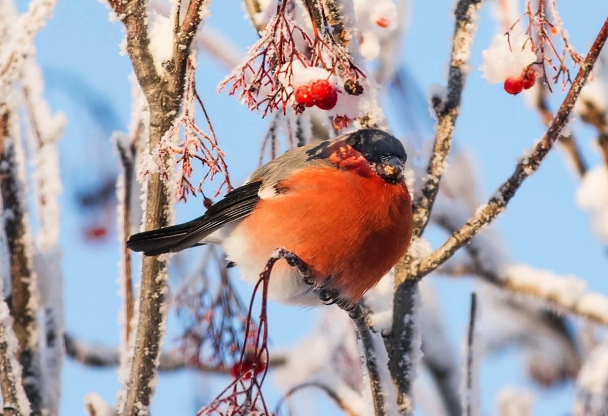 Свиристельки и снегири – лесные птицы, которых летом и не увидишь. Они заняты выведением потомства и стараются от чужих глаз спрятаться в листве. Зато зимой эти яркие птахи отлично видны на деревьях, где есть мороженые плоды. Главное лакомство – рябина. Свиристели в буквальном смысле объедаются ягодами, глотая целиком. Как заметили в Экобиоцентре, за день они могут съесть рябины больше, чем их собственный вес.