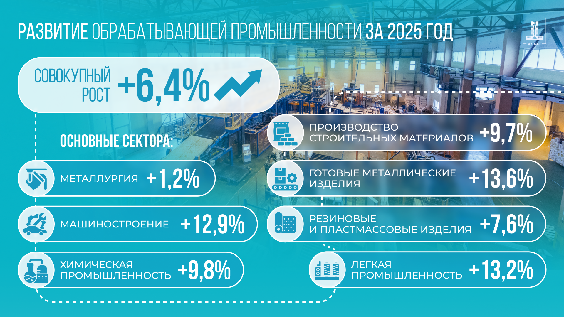 По итогам января–декабря совокупный рост обрабатывающей промышленности составил 6,4%, чему способствовали расширение действующих мощностей и реализация крупных инвестиционных проектов по всей стране. Об этом сообщили в пресс-службе Правительства РК, передает Kazpravda.kz