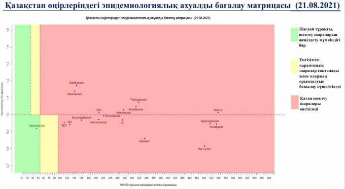 Матрица оценки эпидемиологической ситуации регионах Казахстана на 21 августа.В "красной" зоне: гг. Нур-Султан, Алматы, Шымкент, Акмолинская, Актюбинская, Алматинская, Атырауская, Восточно-Казахстанская, Жамбылская, Западно-Казахстанская, Карагандинская, Костанайская, Кызылординская, Мангистауская, Павлодарская и Северо-Казахстанская области.