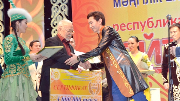 Состязания острословов проходили в два этапа, и лишь к вечеру определились двое финалистов, которые продолжили борьбу за главный приз. Ими оказались Шугайып Сезимхан (Алматы) и Ершат Кайболдин (Актобе). Тема единства, дружбы народов, стабильности, достижения страны за годы независимости нашла отражение в их выступлениях. Умение импровизировать, находить емкое и нередко острое слово не оставили никого равнодушным: зал реагировал громкими аплодисментами и возгласами. Судьи при оценке тоже не могли не учитывать мнение зрителей. По количеству баллов обладателем Гран-при стал Шугайып Сезимхан. Ему и был вручен сертификат на 3 млн тенге (на снимке). Ершат Кайболдин занял первое призовое место и был удостоен денежной премии в 1 млн тенге. Соответственно были награждены и обладатели второго и третьего места, участникам вручены и поощрительные призы. Общий призовой фонд айтыса составил 7 млн 800 тыс. тенге.