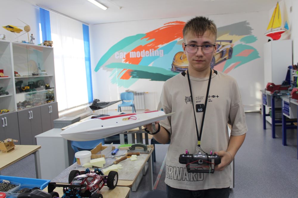 Мальчику помогает его учитель Максим Хуторной. Он ведет секцию автомоделирования и занимается судомодельным спортом. В мастерской я замечаю дипломы, кубки и медали, которые педагог и его ученики завоевали на чемпионатах в Казахстане и за рубежом. Максим Петрович показывает созданные своими руками модели лодок, открывает крышку одной из них. Я заглядываю внутрь и вижу клочки смятой туалетной бумаги. Зачем она тут?