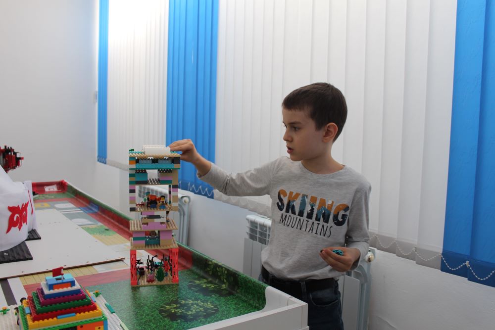 Самое популярное направление в детском технопарке – это робототехника. Захожу в кабинет и вижу, что все парты в нем заняты. Дети сосредоточенно глядят на экран своего ноутбука, собирая из специального конструктора поделки: машинки, корабли, животных и дома с фигурками человечков. Возле окна стоит большой стол, на котором красуются лучшие работы юных робототехников. К нему быстрым шагом подходит восьмилетний Андрей Лебедь и смело презентует свое творение: