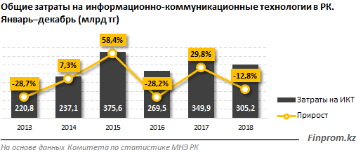 За 2018 год общие затраты на информационно-коммуникационные технологии в РК составили 305,2 млрд тенге, снизившись за год на 12,8%. Для сравнения: в аналогичном периоде годом ранее затраты на ИКТ увеличились на 29,8% до 349,9 млрд тенге.