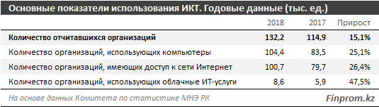 Доля организаций, имеющих доступ к сети Интернет, увеличилась с 69,3% до 76,2%, количество таких предприятий в 2018 году составило 100,7 тыс. единиц (или 96,4% от всех, использующих компьютеры). Также увеличилась доля организаций, использующих облачные ИТ-услуги – с 5,1% до 6,5%.