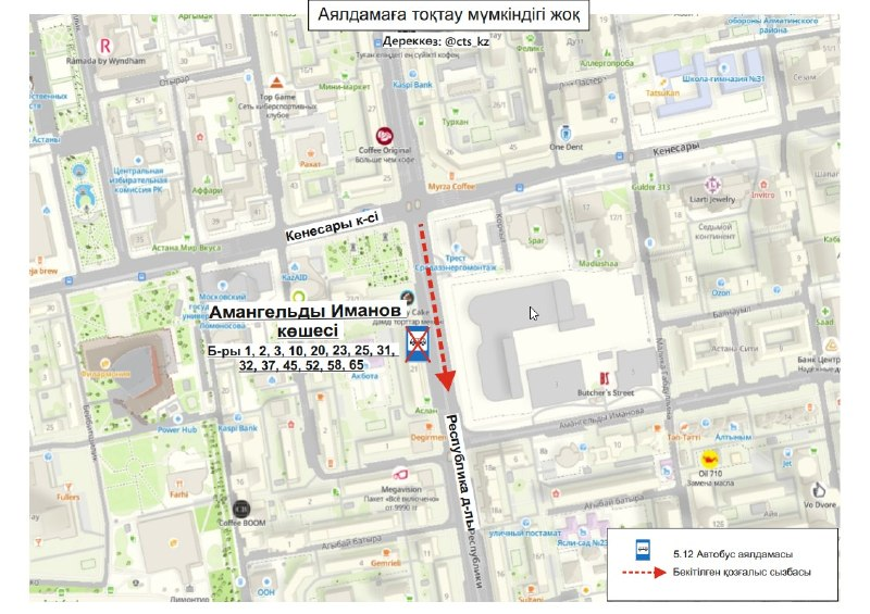 «В связи с перекрытием проезда к остановочному пункту временно изменена схема обслуживания маршрутов. Автобусы не осуществляют посадку и высадку пассажиров на остановке «Улица Амангельды Иманова». Просим учитывать изменения при планировании поездок и заранее корректировать маршрут. Движение будет восстановлено после снятия ограничений», — сообщили в транспортной компании "City Transportation Systems".