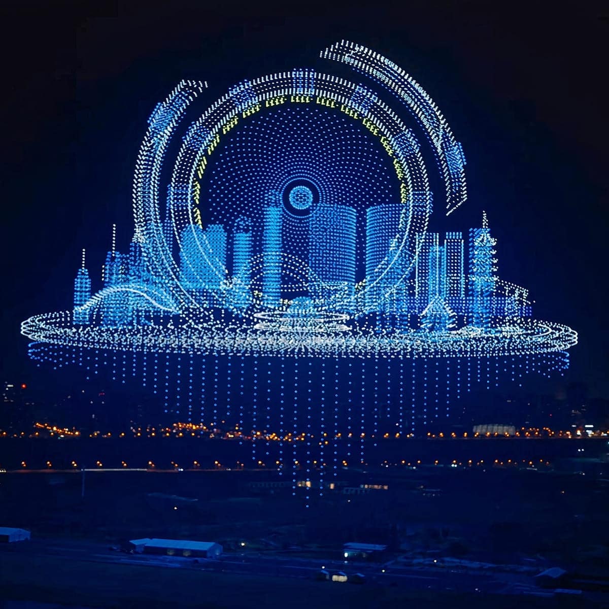 Дроны создавали трехмерные силуэты воображаемого города, а также узнаваемые элементы архитектуры, синхронно дополняя происходящее на сцене. В результате зрители увидели своеобразный воздушный театр, в котором свет, движение и культурные символы слились в единое представление. Каждый дрон был оснащен собственной системой подсветки, и их одновременное включение создавало эффект идеально слаженной визуальной композиции.