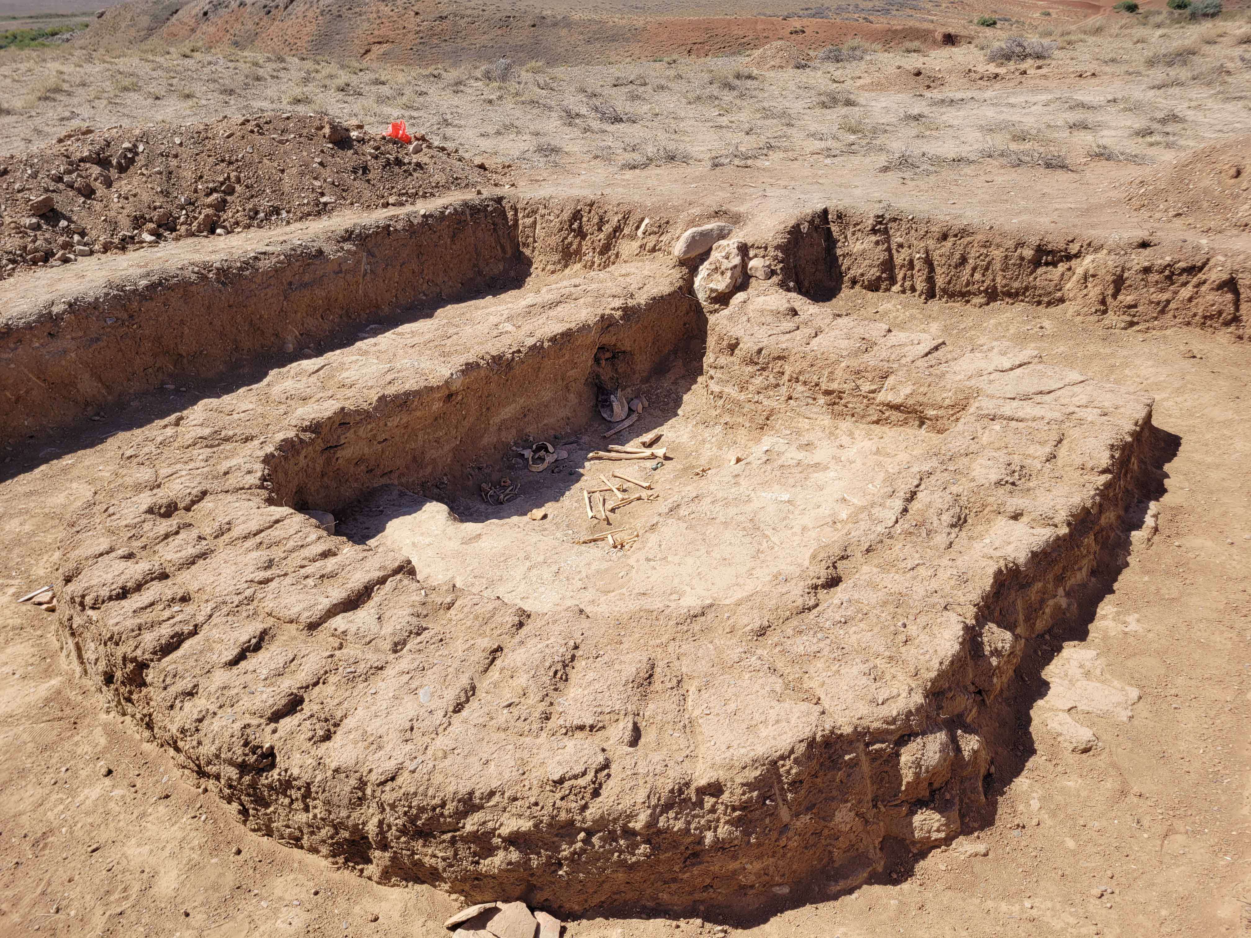 В сузакской степи археологи нашли древний храм, аналогов которому нет в Казахстане Культура 2 сентября 2022 г. 1:15 16478 Любовь Доброта, Туркестанская область Храм у Кызылколя Классика зороастризма Эта местность завораживает своей архаичностью и какой-то особой энергетикой. Это ощущаешь буквально кожей, стоя на берегу древнего озера. На это указывают и неогеновые глины красного цвета по берегам Кызылколя, возраст которых приближается к 23 млн лет. Собственно, отсюда и название озера: Кызылколь – в переводе с казахского языка означает «красное озеро». С востока берег водоема окаймляет вытянутая возвышенность с плоской вершиной, завершающаяся к югу конусовидным бугром – Кызылсенгир, что значит «красная сопка». У ее основания протекает единственная река грунтово-родникового происхождения Ушбас, несущая свои воды в озеро. Стоя на неогеновом останце насыщенного красного цвета, вытянувшемся вдоль южного берега километра на полтора, получаешь великолепный вид на озеро. На горизонте виднеются черные вершины Каратау, словно обрамляющие местность с севера. Соленое озеро уникально по гидрологическим условиям, но еще гораздо более ярко высвечивается в историко-культурном плане. Вокруг него – сотни курганов, поселений и единственный в Казахстане храм-святилище кангюйского времени. Древние зодчие возвели его на верху правильного конусовидного останца из материковых красных неогеновых глин, нарастив его высоту. Это очевидно, учитывая, что в верхней части конуса четко просматривается искусственно сложенная платформа-стилобат из глин другого состава и иного цвета. Его высота порядка 2–2,5 метра. Именно на нем и располагался храм, построенный из горного камня. В степной местности такой строительный материал не найти даже на расстоянии пары десятков километров, а значит его привозили сюда специально. Горный камень использовали не только при сооружении стилобата, но и для строительства здания, возвышавшегося когда-то на холме над степью. В пределах самого храма экспедиция Центра археологии Южно-Казахстанского государственного педагогического университета (ЮКГПУ) обнаружила выложенные камни, чтобы крупные валуны, укрепляющие склон, не падали вниз. Конечно, это сокращало жизненное пространство помещения, что является подтверждением того, что здание не предназначалось для простой жизни. В этом твердо убежден руководитель экспедиции профессор Александр Подушкин. – В ходе раскопок мы открыли так называемую солярную архитектуру: стены внутренних помещений расходятся от центра, словно лучи солнца, – говорит Александр Подушкин. – У здания радиальная планировка. Значительное количество каменных валунов из кладки верхнего контура стен осыпалось на склоны холма, однако общая прямоугольная планировка здания, как и треугольное предвратное сооружение с северной стороны, фиксируется очень хорошо. И, скорее всего, здесь отправляли культы, связанные с первой монотеической религией – зороастризмом. Остатки стен и многочисленные артефакты красноречиво говорят о культовом назначении строения. В нем сочетаются сразу несколько очень весомых храмовых принципов: высокая гора, а многие народы обожествляют горы, озеро, ну и, наконец, камень. Такая каменная архитектура не свойственна для территории Южного Казахстана. В древности здесь строили и
