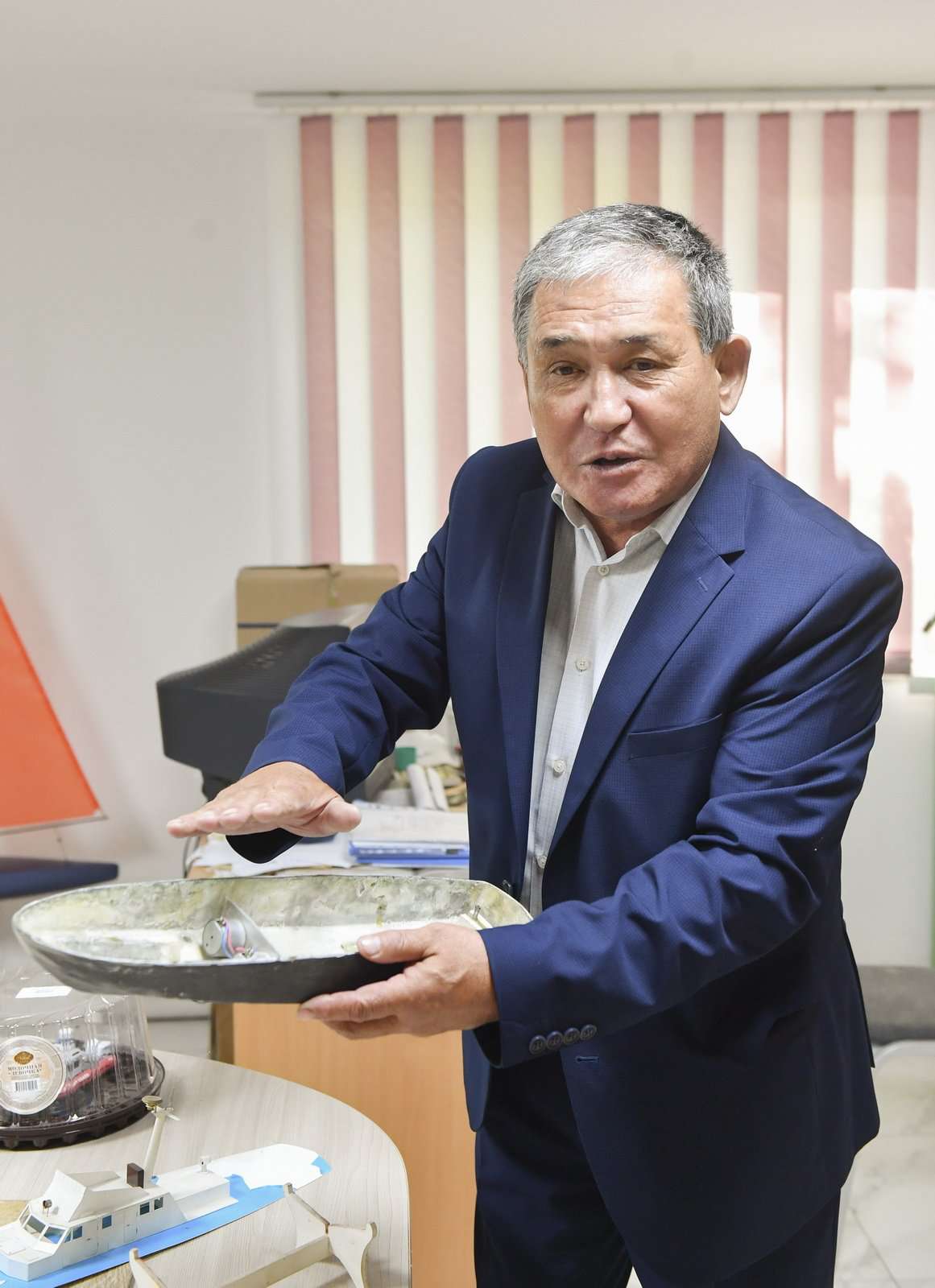 Воспитанник Алихан Кушербаев показывает модель бронекатера. Точная копия, сделанная по чертежам полностью своими руками. Так положено. Внутри пенопласт, снаружи пластик от стеновых сэндвич-панелей. Разъединяешь, верхний слой толщиной 1 мм, нижний – 5 мм. Все идет в дело. Хорошо вырезается ножом. Стволы орудий – это трубочки от антенн радиоприемников.