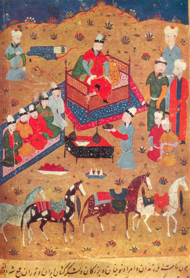 Султан садится на (этот) престол; с правой его стороны хатунь Тайтуглы и рядом с ней хатунь Кабак, а с левой стороны – хатунь Баялунь и возле нее хатунь Урдуджи. У подножия трона стоит справа (старший) сын султана Тинабек, а слева – второй сын его Джанибек. Перед ним сидит дочь его Иткуджуджук. Когда приходит одна из них (хатуней), то султан встает перед ней и держит ее за руку, пока она всходит на престол».
