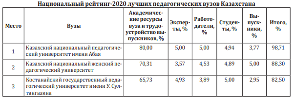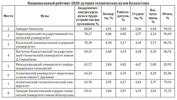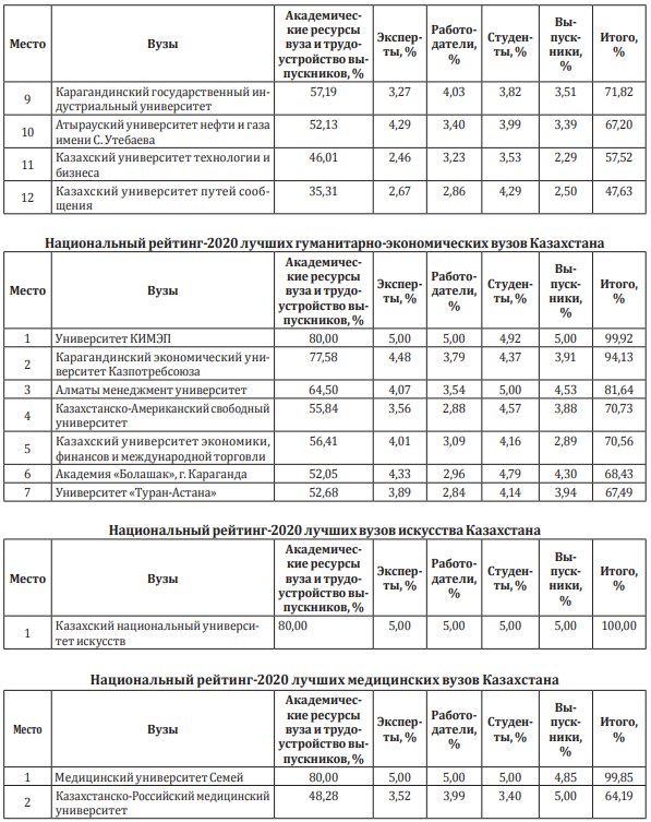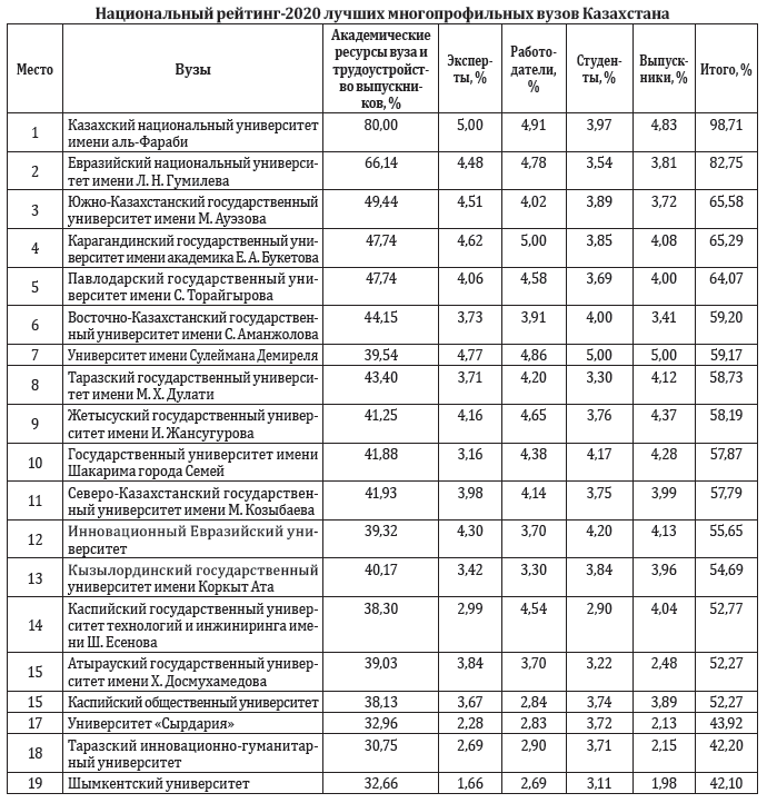 Академические показатели вузов составляют 80% от общей суммы в 100%, включая трудоустройство выпускников. 20% от общей суммы приходится на репутационную оценку вузов казахстанскими и зарубежными экспертами в сфере высшего образования, репутационную оценку работодателей, оценку вуза его выпускниками и студентами. На каждую оценку приходится по 5% от общей суммы. Более подробно с методологией и распределением весовых процентов по индикаторам и критериям можно ознакомиться на сайте агентства www.iqaa-ranking.kz. Результаты Национального рейтинга 2020 будут дополнительно опубликованы в электронном виде на сайте www.egov.kz.
