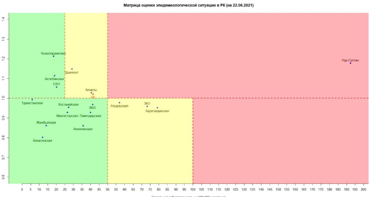 Представлена матрица эпидемиологической ситуации по коронавирусу в Казахстане на 21 июня, передает Kazpravda.kz со ссылкой на МВК по нераспространению COVID-19.